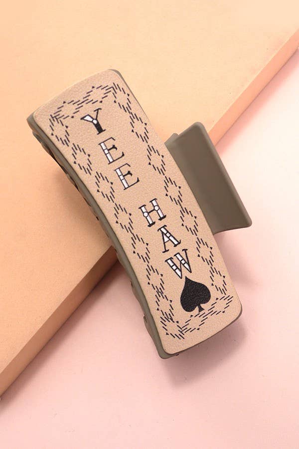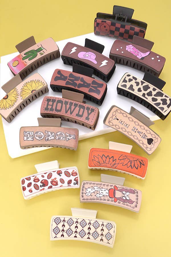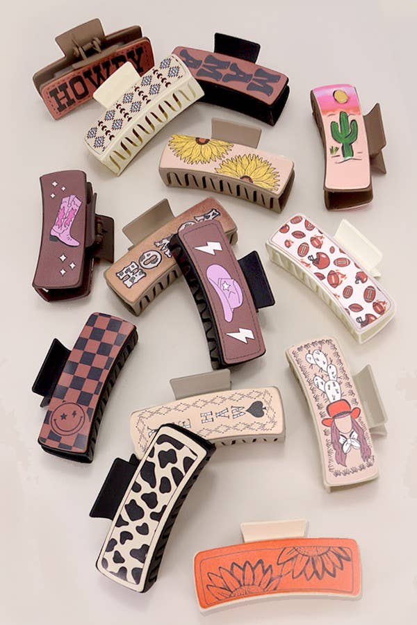 Faux Leather Western Cowgirl Hair Claw Clips, a stylish and rustic accessory that adds a touch of Western charm to your hairstyle. These hair claw clips feature faux leather accents in Western-inspired designs, perfect for capturing the spirit of the Wild West in your hairdo. With their sturdy grip and eye-catching detailing, they're ideal for securing your hair in place while adding a dash of cowgirl flair to your look.